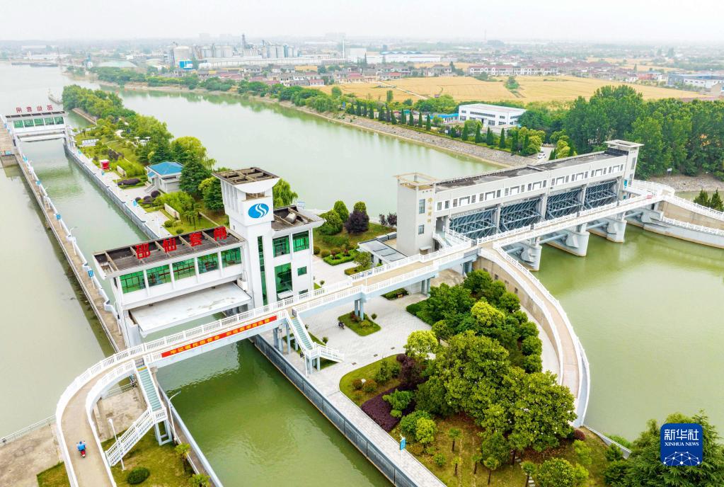 這是6月1日拍攝的位于江蘇省揚州市江都區的南水北調東線(xiàn)一期工程邵仙套閘、邵仙閘洞(無(wú)人機照片)。
