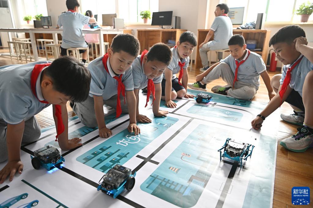 5月31日,中關(guān)村第三小學(xué)雄安校區編程社團的學(xué)生檢驗機器人的編程效果。