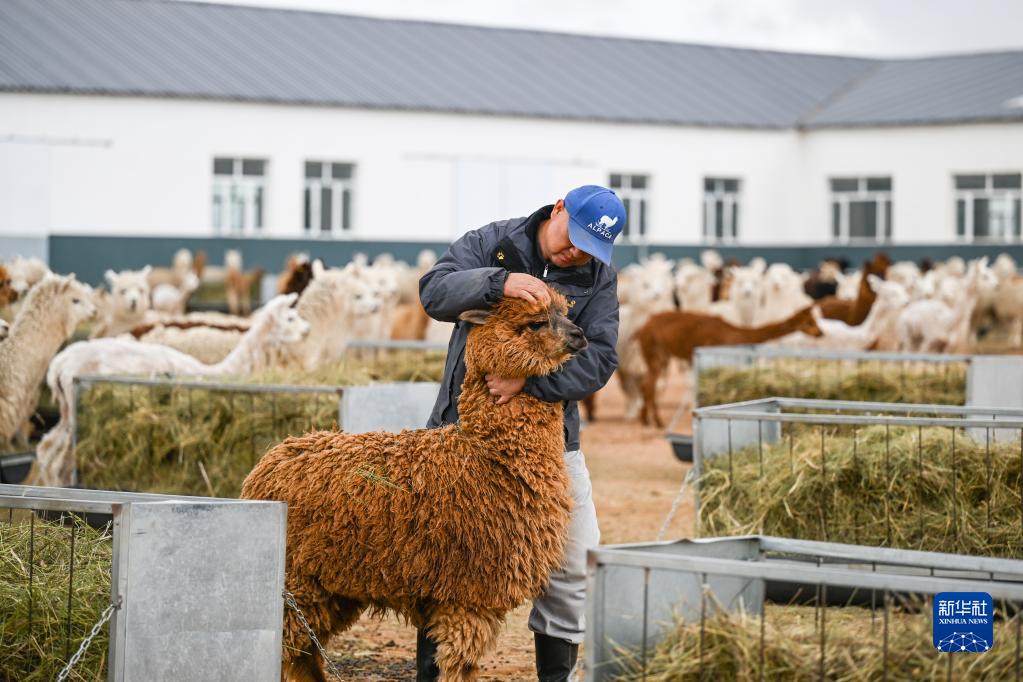 6月1日,巴彥杭蓋嘎查羊駝養殖基地的工作人員在觀(guān)察羊駝的飼養情況。
