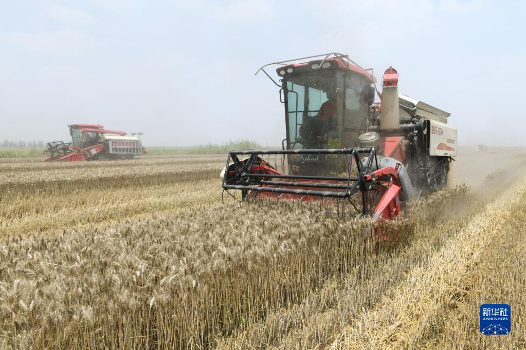 6月1日,在安徽省阜陽(yáng)市阜南縣曹集鎮阜蒙農場(chǎng),收割機在收割小麥。