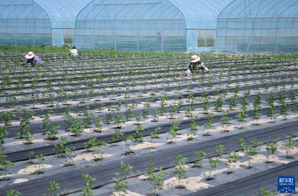 6月1日,河北雄安新區安新縣陽(yáng)雀湖西里現代農業(yè)產(chǎn)業(yè)園區工人在管護辣椒秧苗。