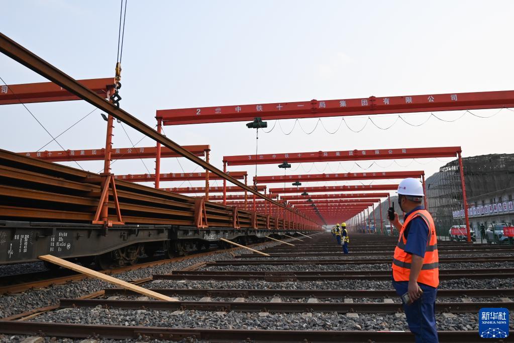 6月1日,中鐵十一局工程技術(shù)人員在杭溫鐵路義烏鋪軌基地堆碼500米長(cháng)鋼軌。