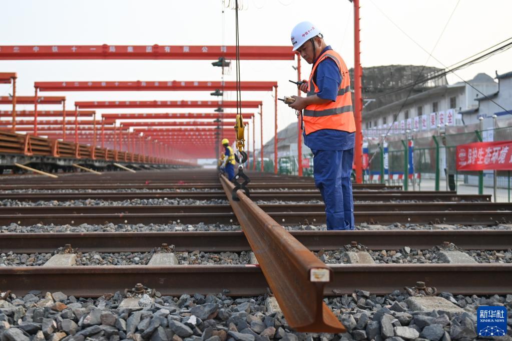 6月1日,中鐵十一局工程技術(shù)人員在杭溫鐵路義烏鋪軌基地堆碼500米長(cháng)鋼軌。