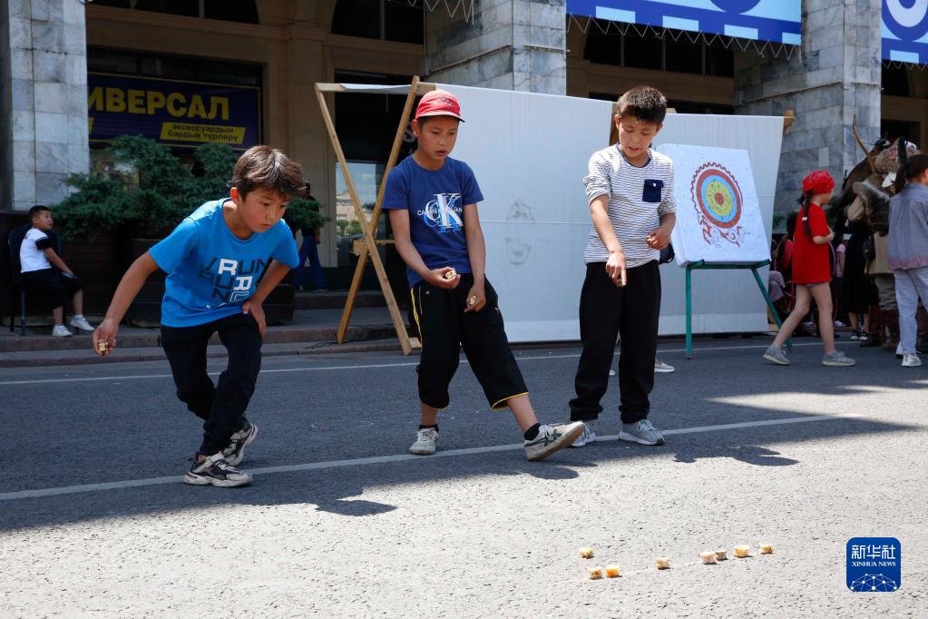 6月1日,孩子們在吉爾吉斯斯坦首都比什凱克阿拉套廣場(chǎng)做游戲,慶?!傲弧眹H兒童節。