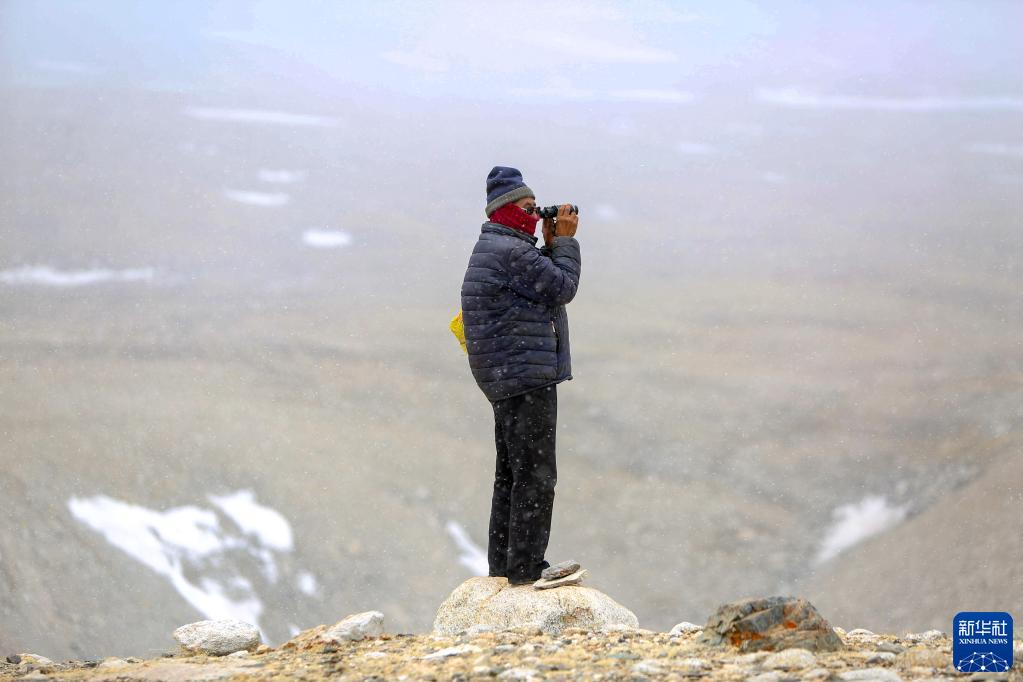 5月31日,乃乃老人用望遠鏡觀(guān)察遠處的杰瑪央宗冰川。新華社記者 邵澤東 攝
