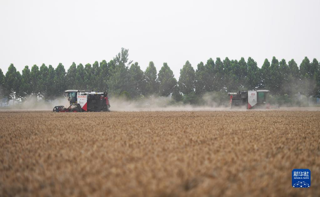 6月1日,在河南省駐馬店市上蔡縣邵店鎮后楊村,收割機在搶收小麥。新華社記者 張浩然 攝