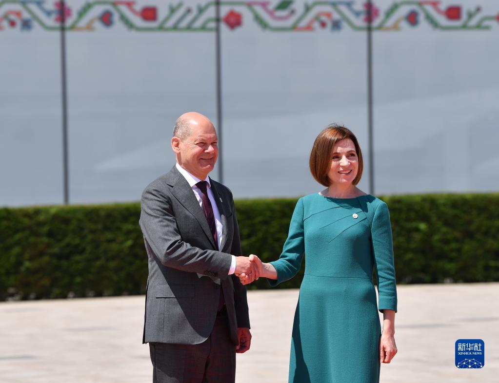 6月1日,在摩爾多瓦布爾博阿克,摩爾多瓦總統桑杜(右)歡迎前來(lái)參加第二屆歐洲政治共同體領(lǐng)導人會(huì )議的德國總理朔爾茨。