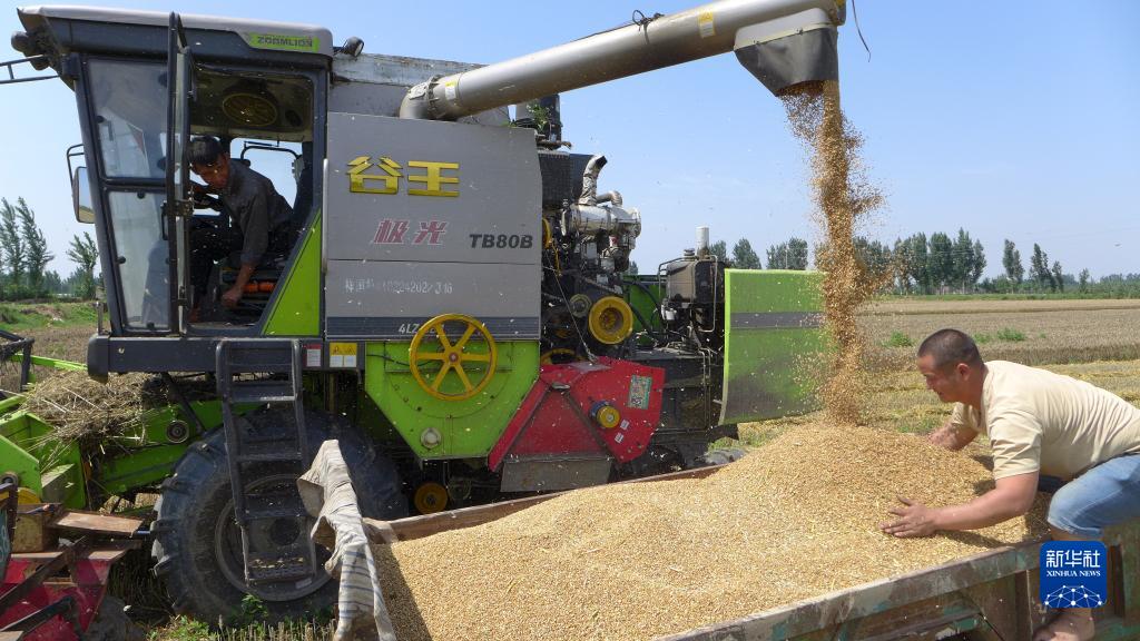6月1日,河南省開(kāi)封市祥符區范村鄉許墩村農民在田間收小麥。