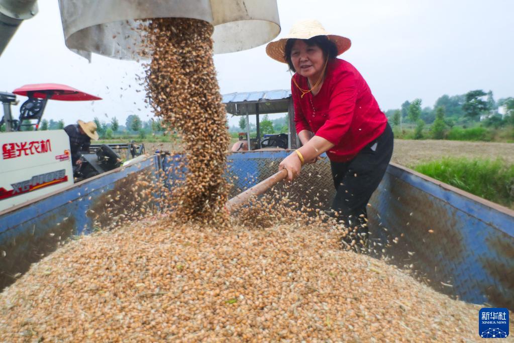 6月2日,河南省信陽(yáng)市光山縣羅陳鄉張樓村青龍河合作社農民在搶收小麥。
