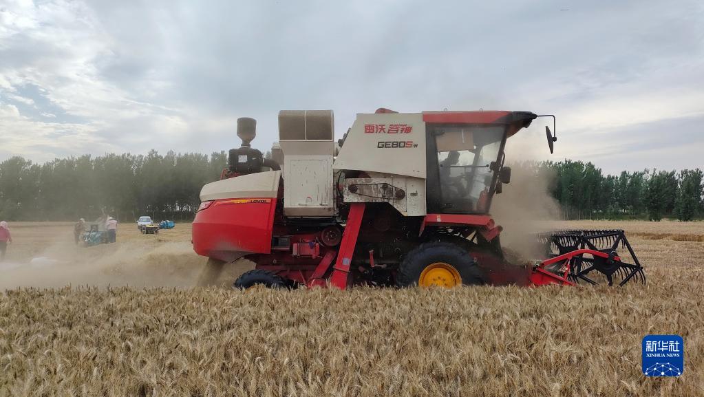 6月2日,在河南省開(kāi)封市龍亭區北郊鄉寧陵屯村,農機手操作收割機在田間收割小麥。