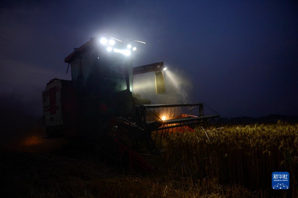 6月1日晚,在河南省駐馬店市汝南縣老君廟鎮,農民操作收割機搶收小麥。