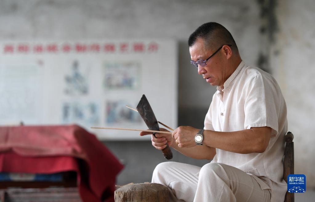 6月1日,在廣西賓陽(yáng)縣賓州鎮陸村,陸云崗在剖竹篾準備制作油紙傘。