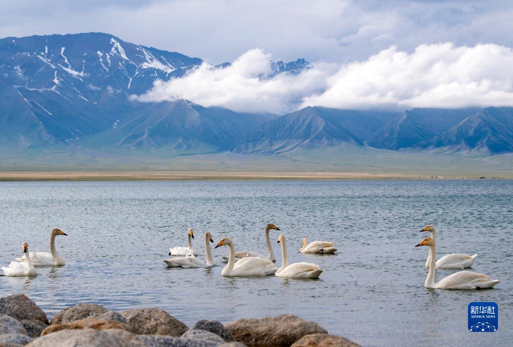 在新疆賽里木湖拍攝的天鵝(5月21日攝)。