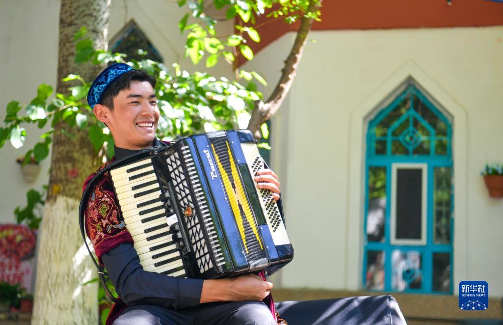 一名樂(lè )手在新疆伊寧市六星街街頭準備演奏手風(fēng)琴(5月17日攝)。