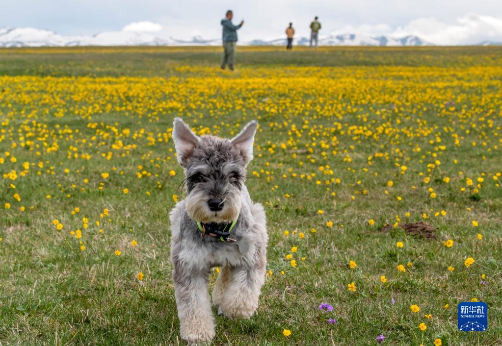 一只寵物狗在新疆賽里木湖邊奔跑(5月21日攝)。
