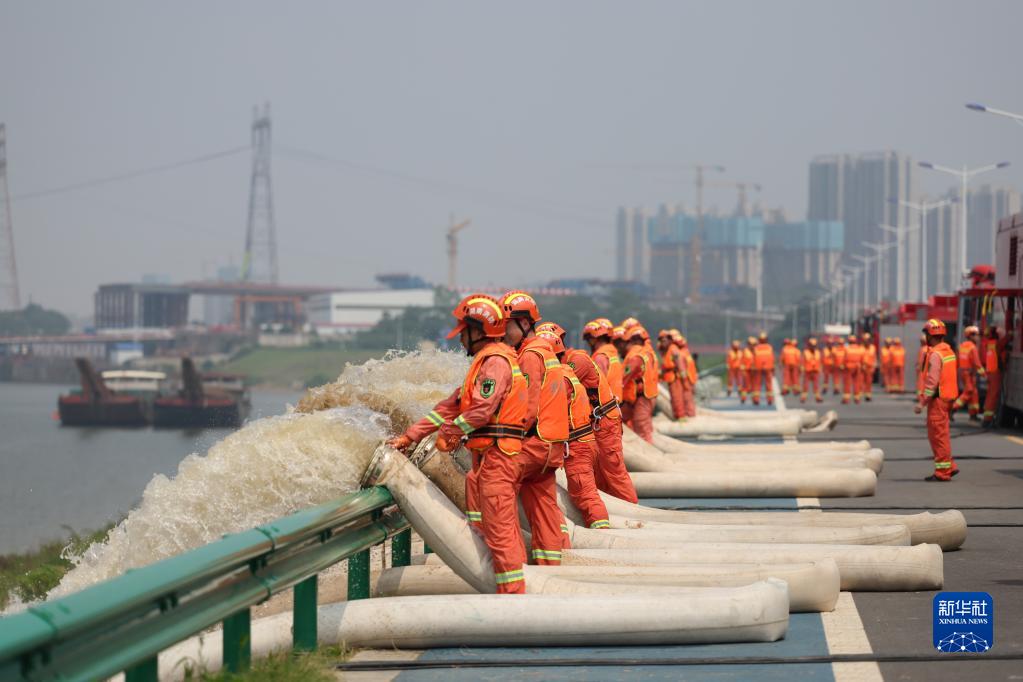 6月2日,在水域救援實(shí)戰演習現場(chǎng),消防救援人員在湘江邊模擬內澇排水。