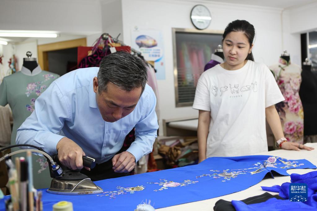 5月31日,江滿(mǎn)宗(左)在上海市“龍鳳旗袍制作技藝——國家級非物質(zhì)文化遺產(chǎn)傳習所”整燙繡花片。