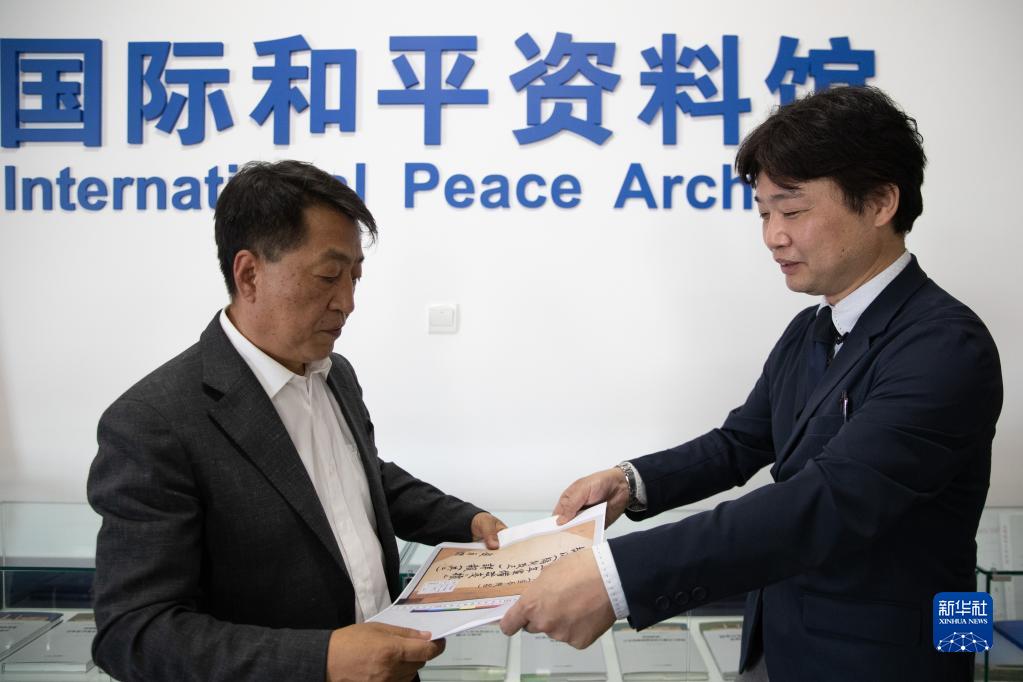 6月1日,日本學(xué)者松野誠也(右)將影印資料贈予侵華日軍第七三一部隊罪證陳列館館長(cháng)金成民。