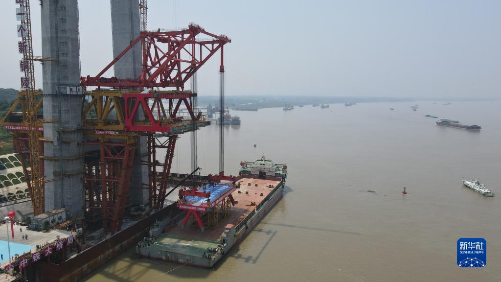 6月2日拍攝的京臺高速銅陵長(cháng)江公鐵大橋主橋鋼梁架設施工現場(chǎng)(無(wú)人機照片)。