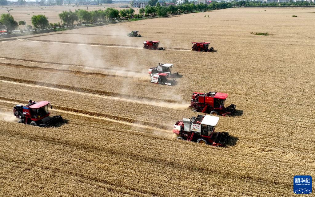 6月2日,在安徽省亳州市利辛縣胡集鎮張莊村明遠種植專(zhuān)業(yè)合作社,農機手駕駛收割機搶收小麥(無(wú)人機照片)。