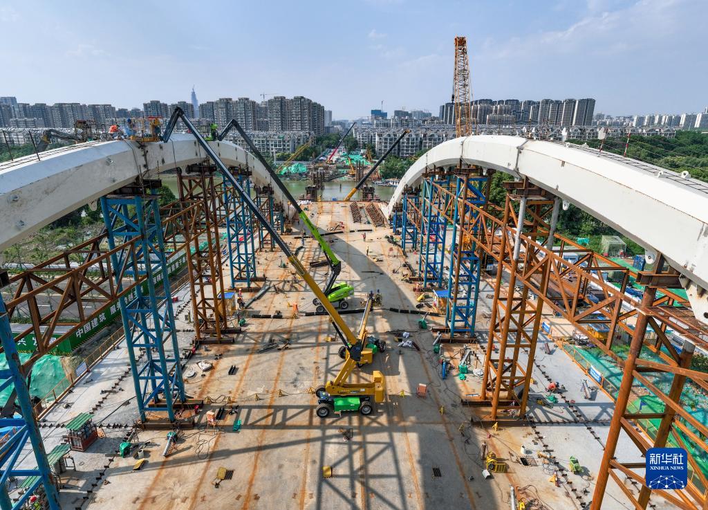 這是6月2日拍攝的南京梅苑南路跨秦淮新河大橋施工現場(chǎng)(無(wú)人機照片)。