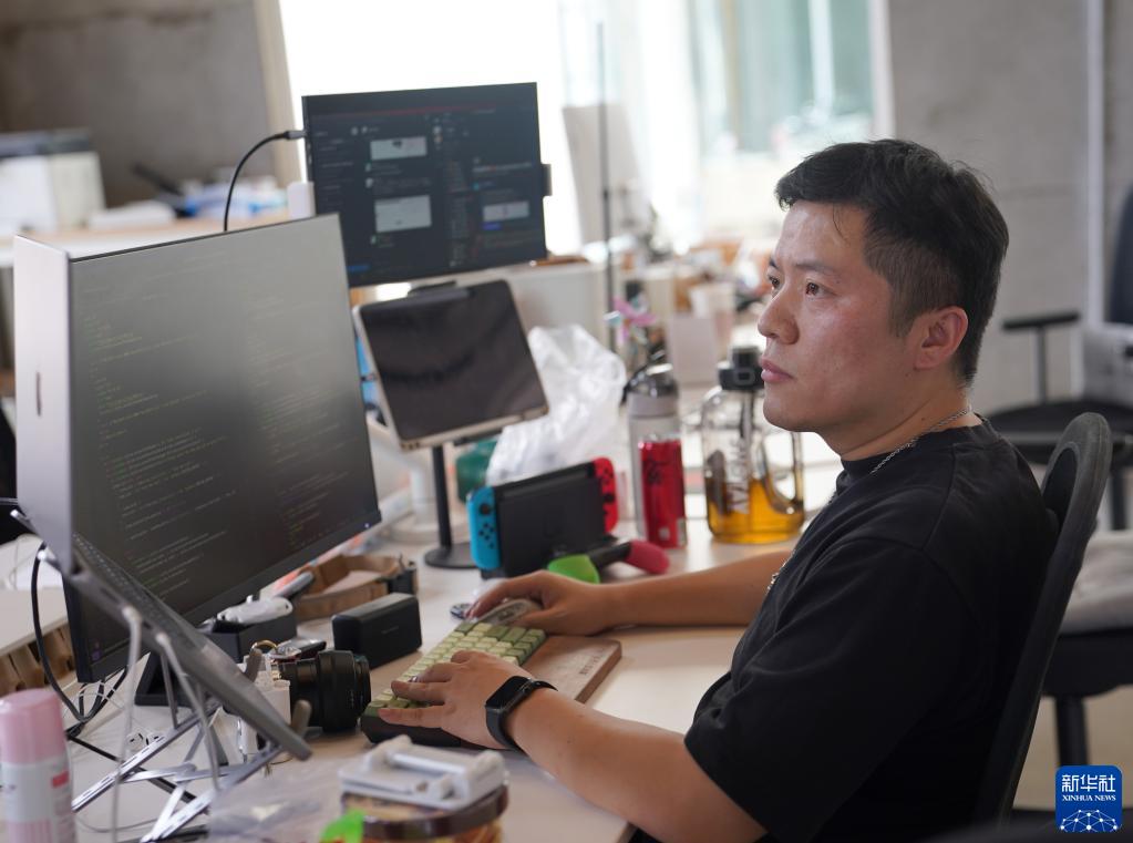 6月2日,程序員李黃杰在“數字游民公社”共享辦公區內檢查軟件代碼。