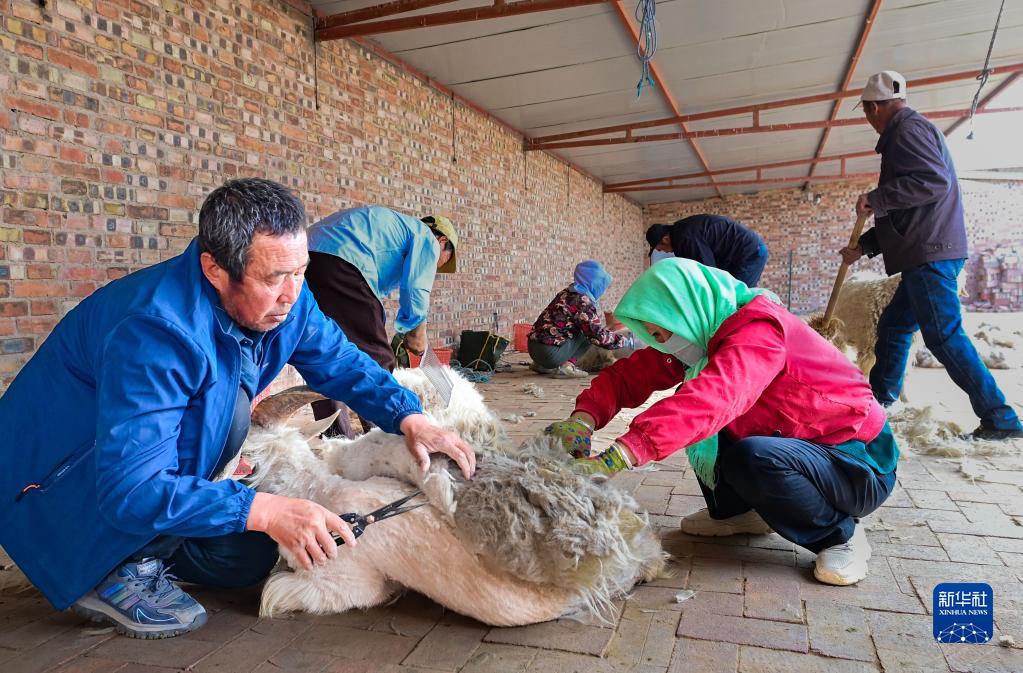 6月2日,在鄂爾多斯市鄂托克前旗,牧民在給阿爾巴斯絨山羊剪羊毛。