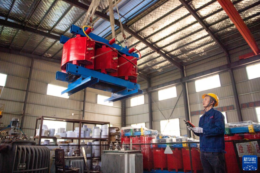 6月2日,在位于婁底經(jīng)開(kāi)區的湖南樂(lè )立保電氣有限公司,工人在吊裝變壓器。