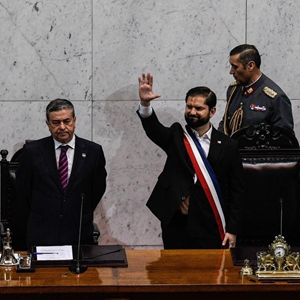 6月1日,智利總統博里奇(中)在瓦爾帕萊索的國會(huì )大廈揮手致意。