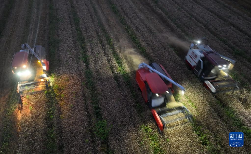 6月2日晚,農民在浙江省湖州市德清縣阜溪街道龍勝村駕駛農機收獲小麥(無(wú)人機照片)。