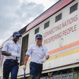 5月23日,在肯尼亞內羅畢,蔣立平(右)與學(xué)員霍勒斯從一輛印有“連接國家 走向繁榮”標語(yǔ)的蒙內鐵路機車(chē)旁走過(guò)。