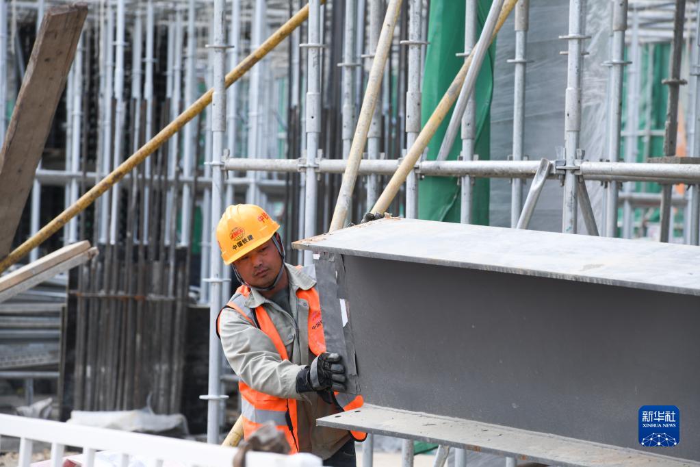 在伊春西站主體結構施工現場(chǎng),工人在建設作業(yè)(6月2日攝)。