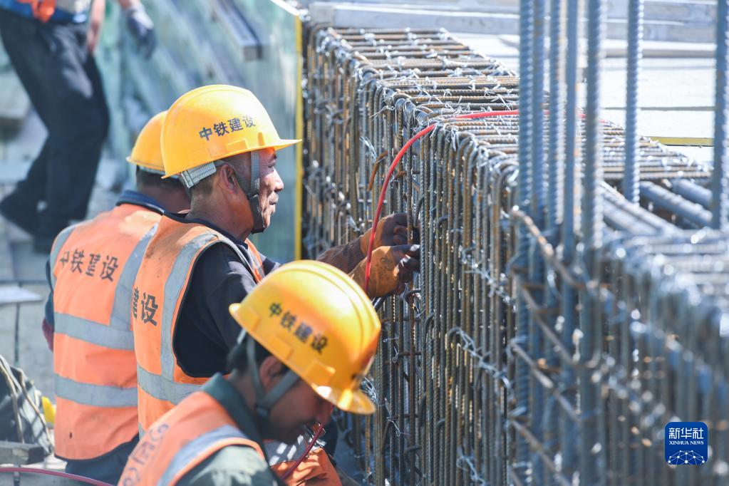 在伊春西站主體結構施工現場(chǎng),工人在建設作業(yè)(6月2日攝)。