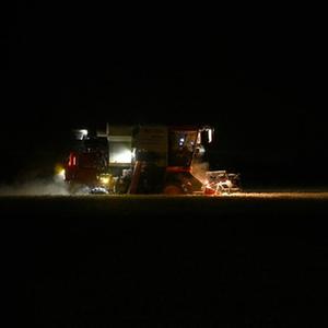 6月2日夜晚,在阜陽(yáng)市阜南縣苗集鎮的一處麥田,農機手駕駛收割機收割小麥。
