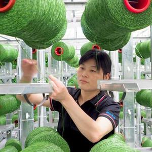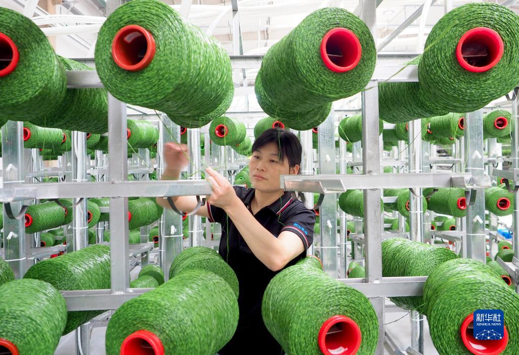 6月2日,在山東省樂(lè )陵市泰山體育產(chǎn)業(yè)集團有限公司,工人在人造草坪智能化生產(chǎn)車(chē)間作業(yè)。