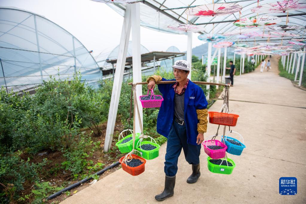 6月3日,在冷水江市金竹山鎮新田村藍莓基地,果農運輸準備銷(xiāo)售的藍莓。