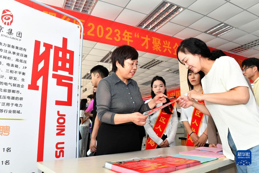 6月3日,在邯鄲市肥鄉區舉行的招聘會(huì )上,工作人員向求職者介紹用工情況。