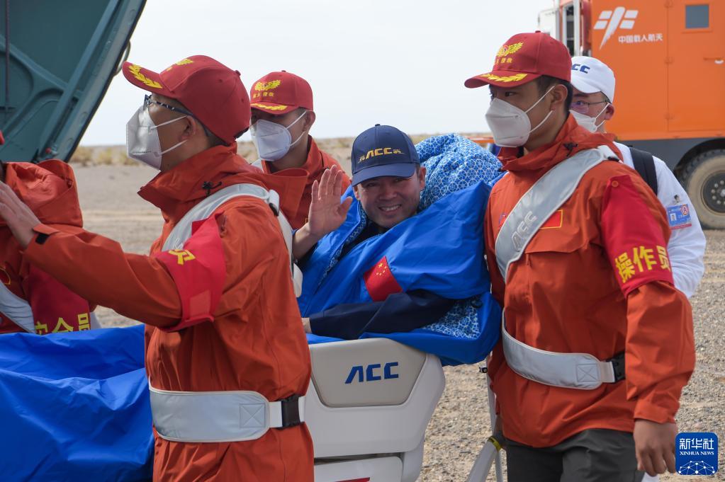 6月4日,神舟十五號載人飛船返回艙在東風(fēng)著(zhù)陸場(chǎng)成功著(zhù)陸,神舟十五號載人飛行任務(wù)取得圓滿(mǎn)成功。這是航天員張陸揮手致意。新華社記者 李志鵬 攝