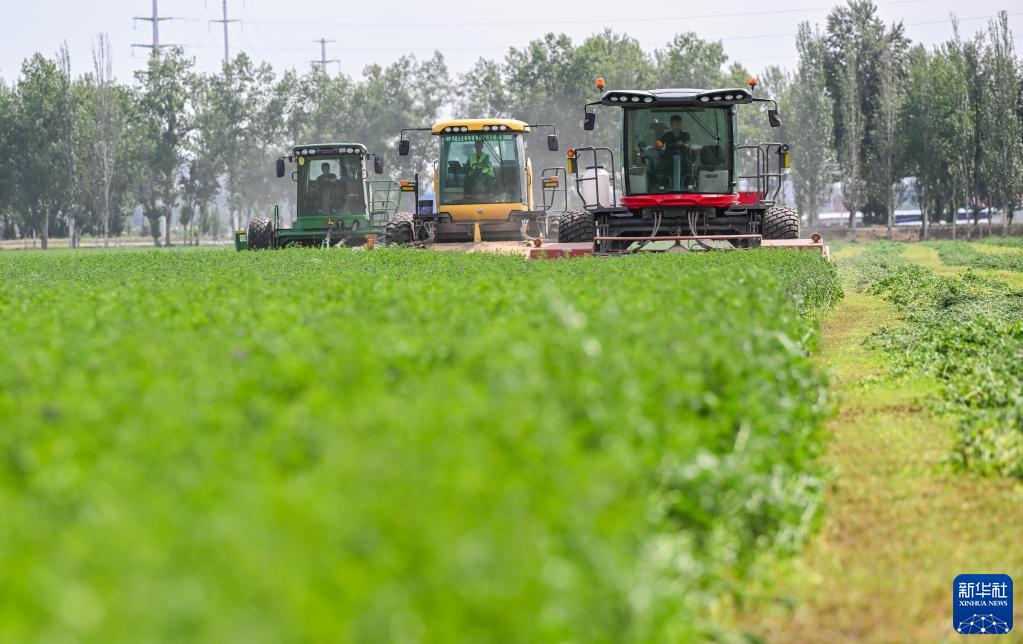 6月4日,在土默特左旗國家現代農業(yè)示范區內,機械車(chē)輛在收割苜蓿。