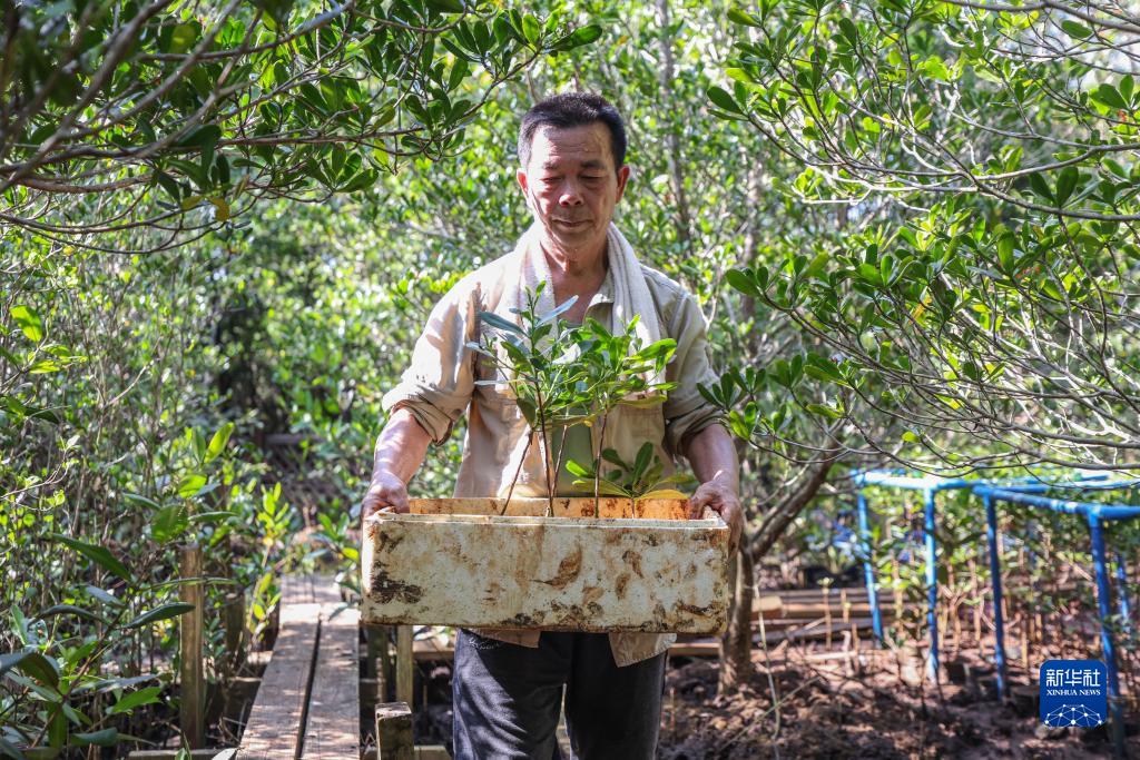 6月2日,王式軍在海南東寨港國家級自然保護區的苗圃?xún)裙茏o紅欖李幼苗。