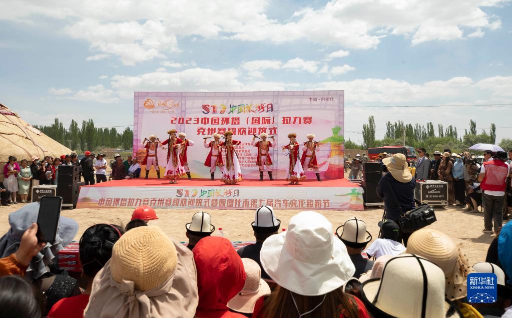 5月22日,在新疆克孜勒蘇柯?tīng)柨俗巫灾沃莅D什市哈拉峻鄉,歌舞演員歡迎參賽選手抵達第二賽段終點(diǎn)。