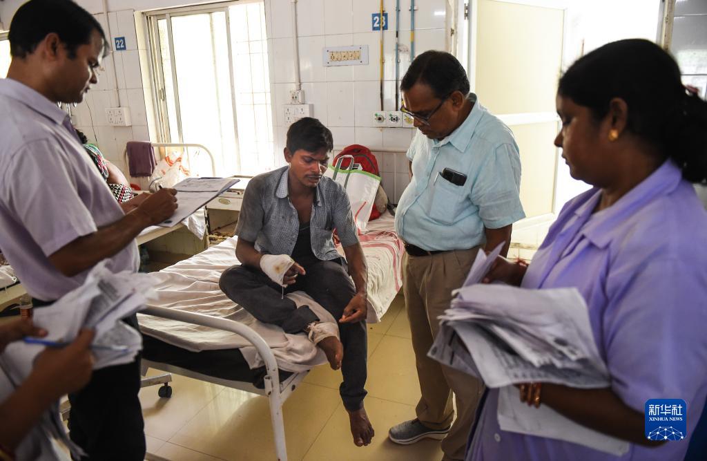 6月4日,列車(chē)脫軌相撞事故的傷者在印度奧迪沙邦巴拉索爾的一家醫院接受醫生檢查。
