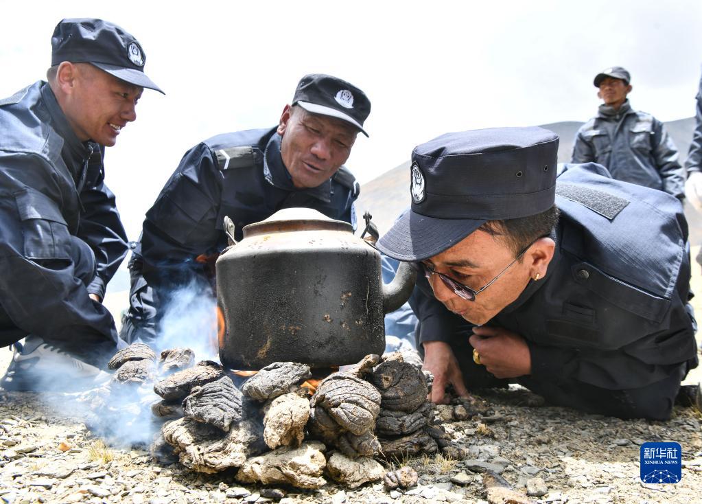 護邊聯(lián)防隊隊員在一塊空地上點(diǎn)燃牛糞,準備午餐(6月2日攝)。