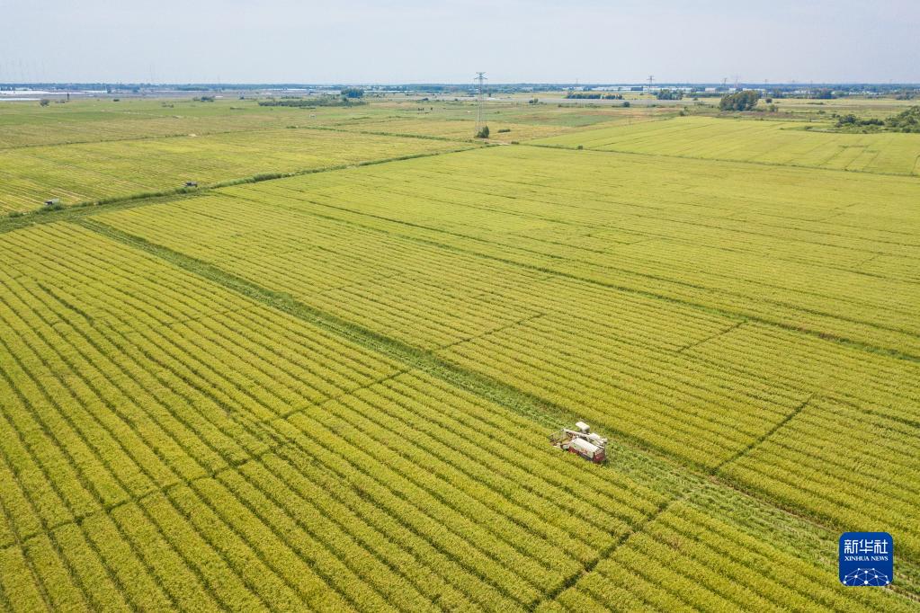 6月4日,在位于海南省東方市的海南農樂(lè )南繁科技有限公司制種基地,工人駕駛收割機搶收稻種(無(wú)人機照片)。