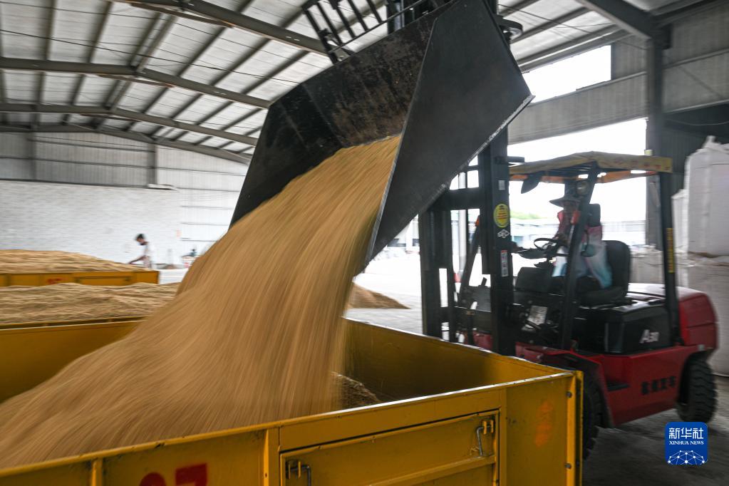 6月4日,在位于海南省東方市的海南農樂(lè )南繁科技有限公司制種基地,工人駕駛叉車(chē)將收獲的稻種運入烘干倉。
