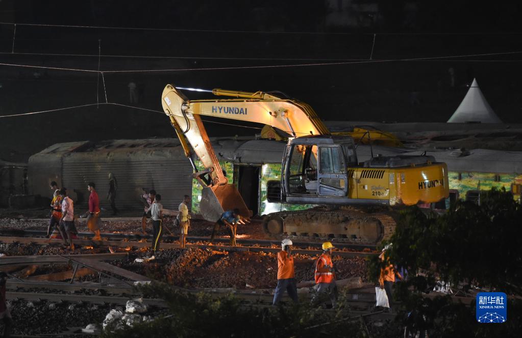 6月4日,救援人員在印度奧迪沙邦巴拉索爾地區的列車(chē)脫軌相撞事故現場(chǎng)工作。