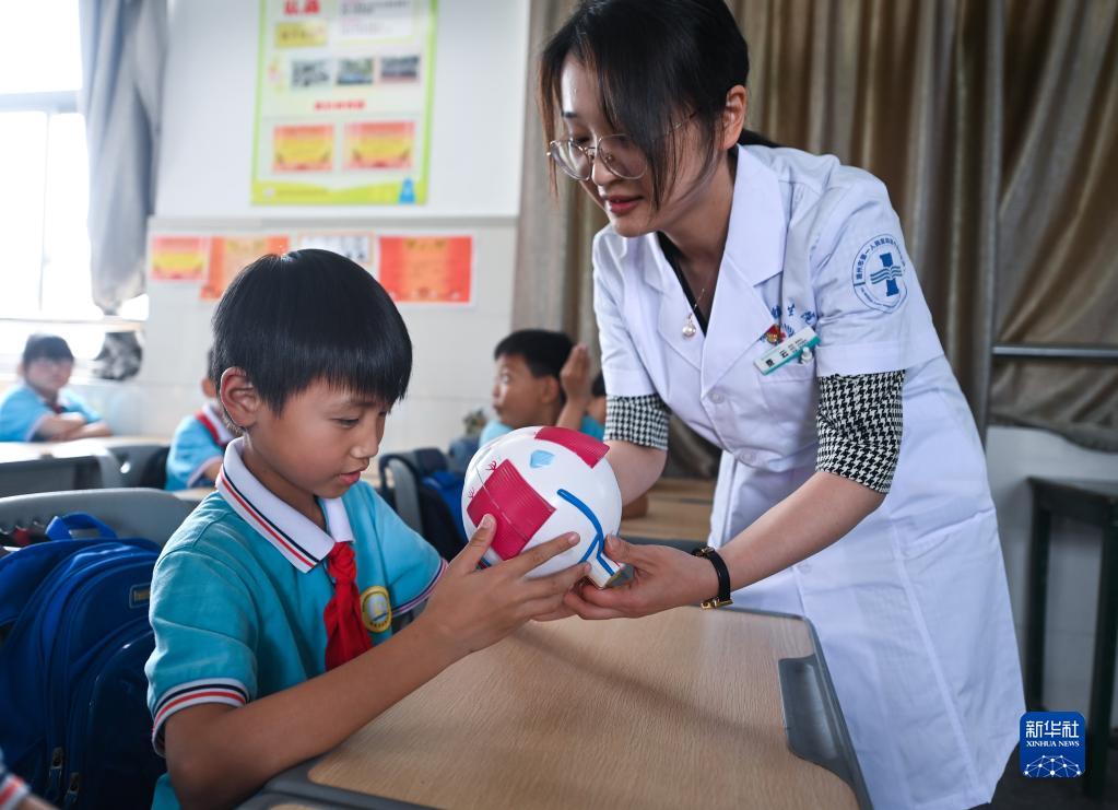 6月5日,東林鎮衛生院的醫生給小學(xué)生們介紹眼球結構。