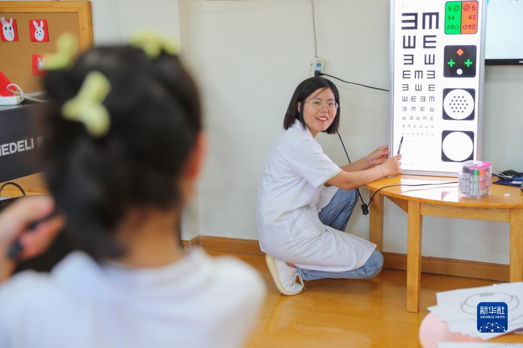 6月5日,在浙江省湖州市德清縣武康街道伊頓幼兒園里,眼科醫生在給小朋友檢查視力。