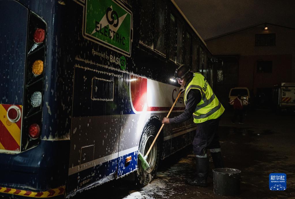 6月2日,在肯尼亞內羅畢,肯尼亞電動(dòng)巴士公司工作人員清潔電動(dòng)巴士。