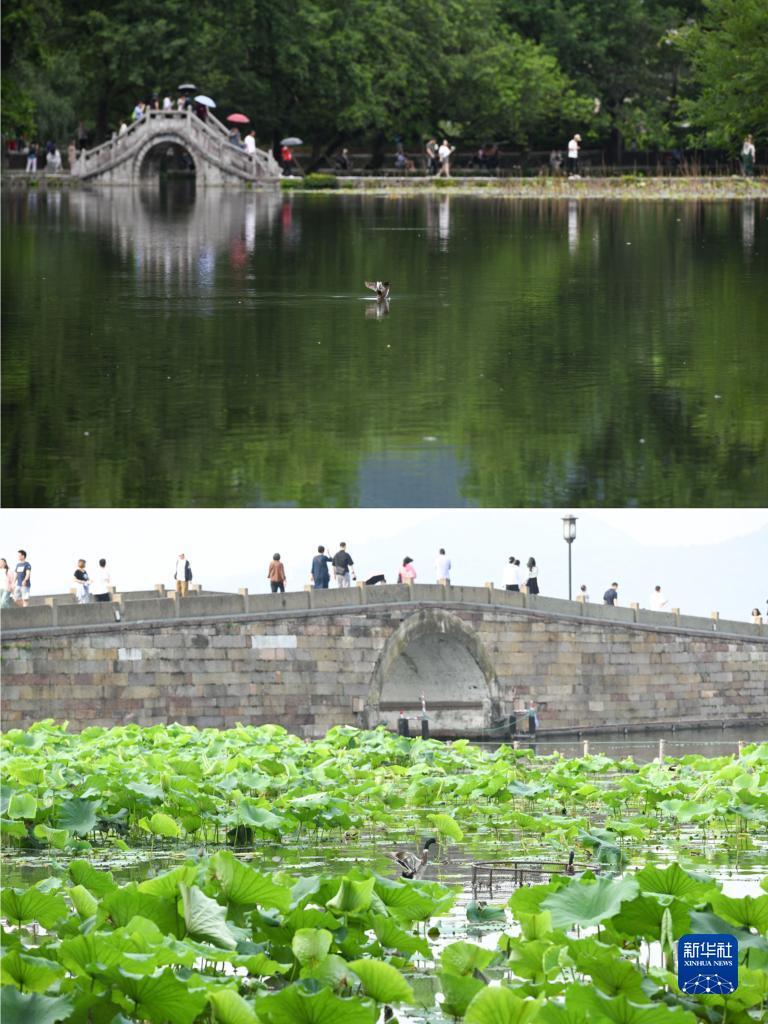 拼版圖片:上圖為5月31日拍攝的安徽省黃山市宏村風(fēng)景(新華社記者 張端 攝);下圖為6月4日拍攝的浙江省杭州市西湖風(fēng)景(新華社記者 黃宗治 攝)。
